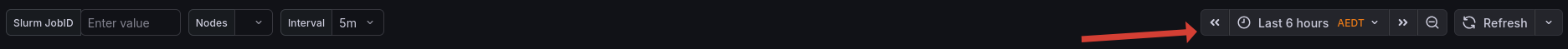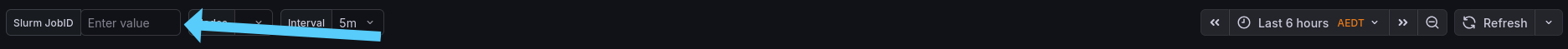 Enter the slurm job number of the job you wish to review into the "Slurm JobID" box on the top left of the dashboard. You should see the Nodes dropdown menu automatically update with a list of nodes assigned to the job. You can enable all nodes by clicking the top tickbox in the list, or toggle single nodes by ticking or unticking their corresponding box.